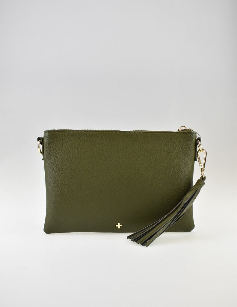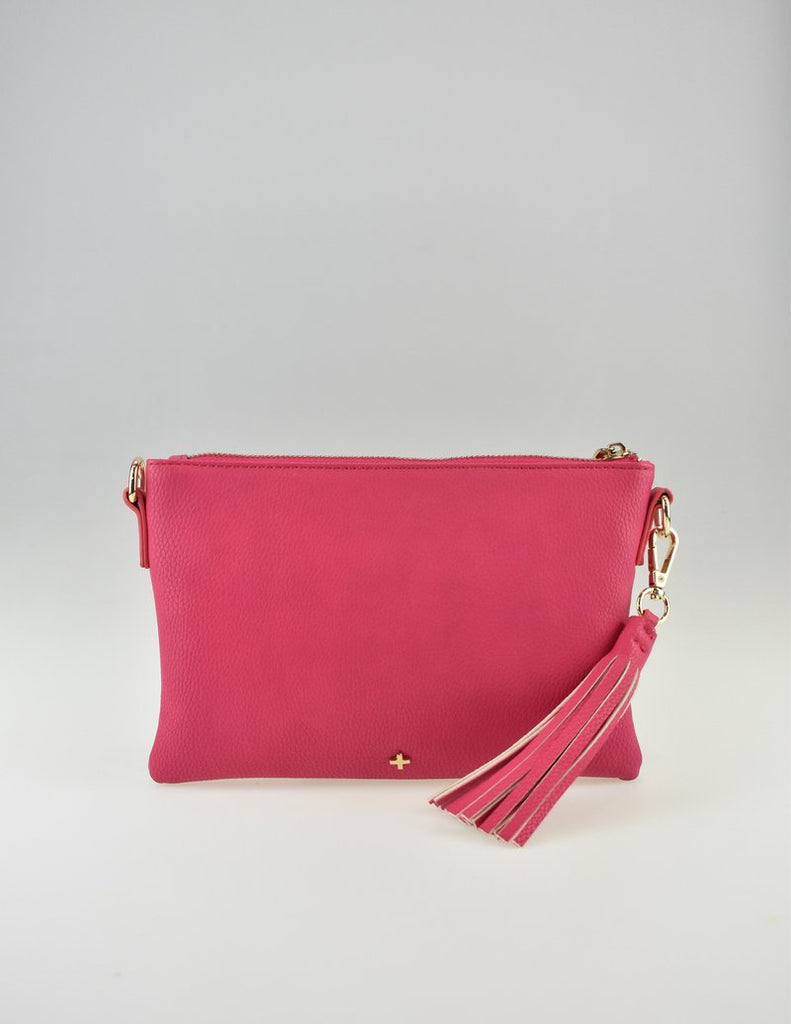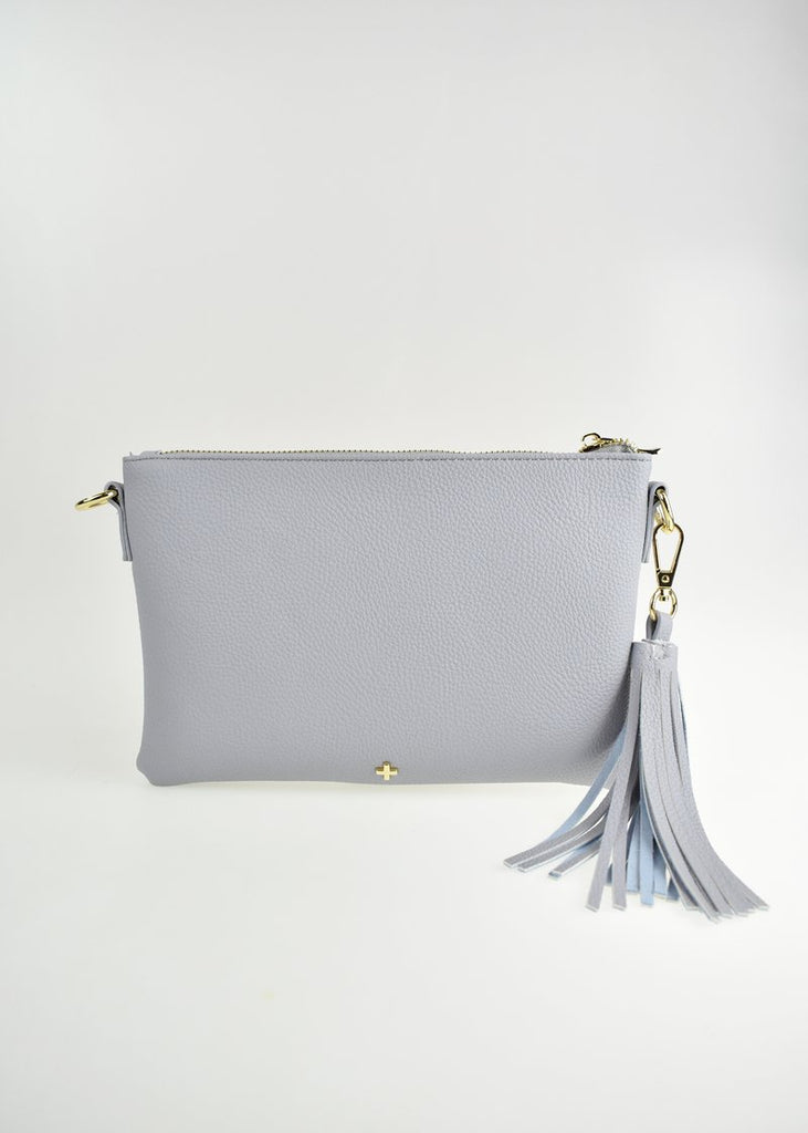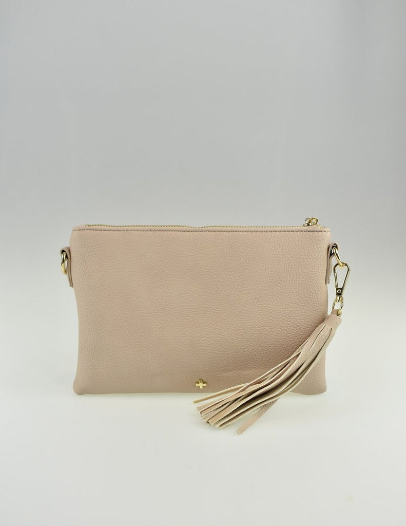 The Kourtney zip top cross body features an adjustable and removable strap. It also comes with a removable tassel. It can be used as a clutch or a cross body bag. Fits an iphone 7+. Pebbled vegan leather with light gold hardware.
